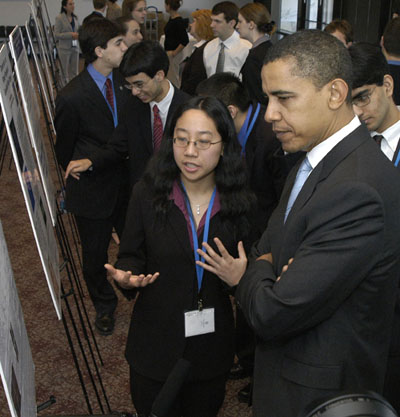 Cindy excitedly explains her project to Senator Obama. (Photo